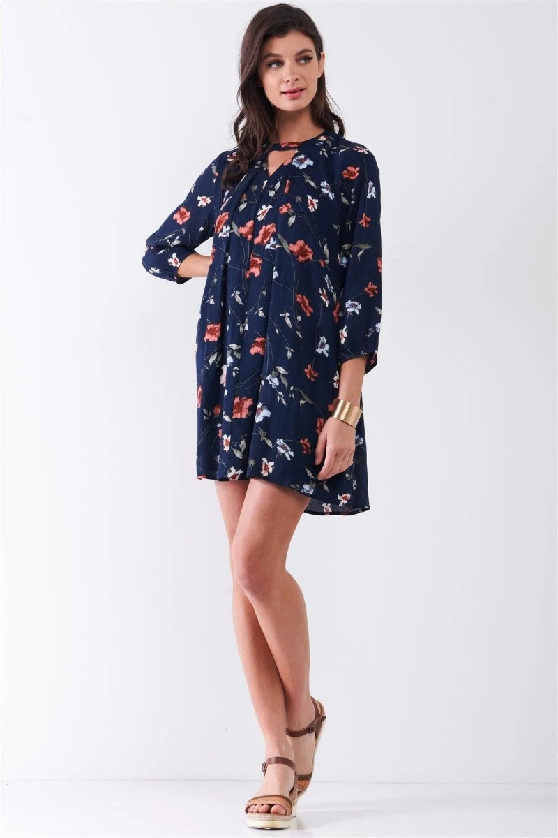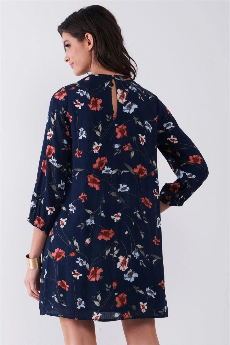 Design: Navy Multicolor Floral Print Long Sleeve Pleated Front V-Neck Loose Mini Dress — a vibrant floral print with a flattering V-neck and long sleeves.