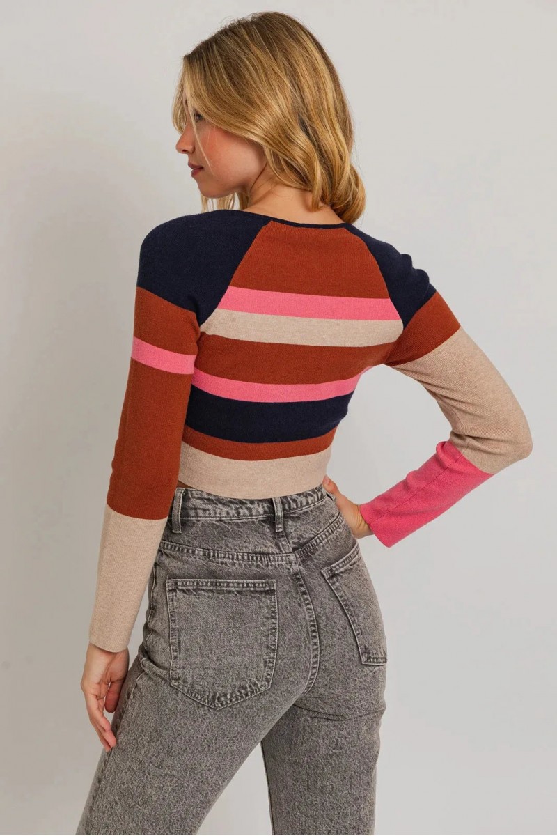 Introducing the Color Block Square Neckline Crop Sweater - a stylish and versatile addition to your wardrobe. Made with a square neckline and color-block design, this crop sweater is perfect for any occasion. Stay warm and on-trend with this must-have piece.