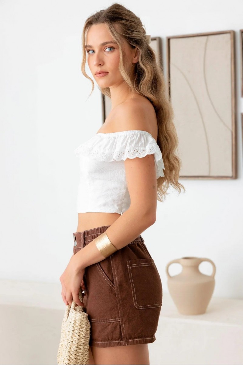 • Product Code: Off Shoulder Ruffle Lace Trim Crop Top