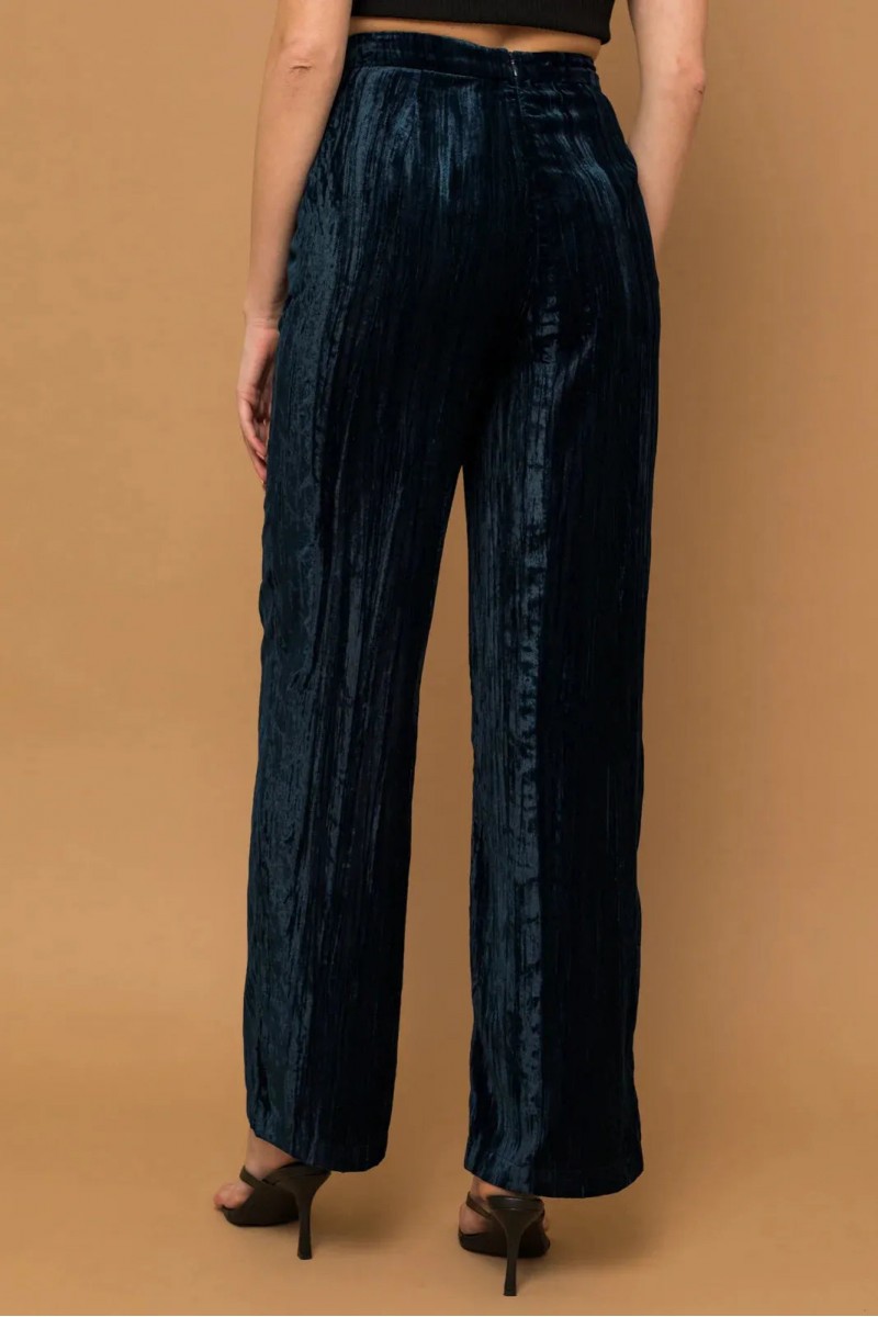 Crafted from luxurious navy blue crinkle velvet, these wide leg pants are a must-have for any fashion-forward wardrobe. The fabric's unique texture adds dimension and interest to any outfit, while the wide leg silhouette creates a flattering and comfortable fit. Elevate your style with these stunning and chic pants.