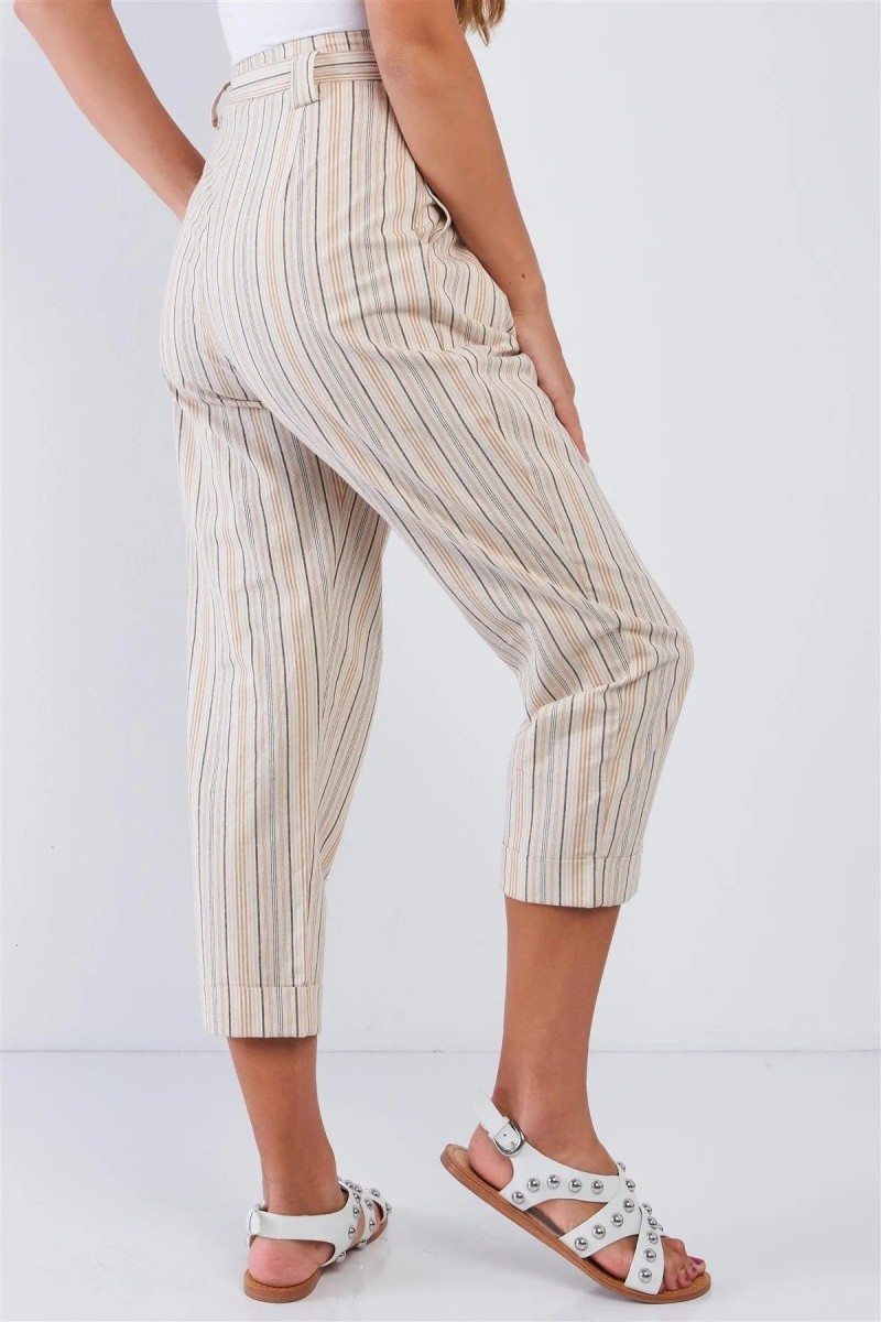 Design: Natural Striped High Waisted Tapered Folded Hem Pants — a stylish pair of pants featuring a natural striped pattern, high-waisted fit, and tapered leg for a modern, tailored look.