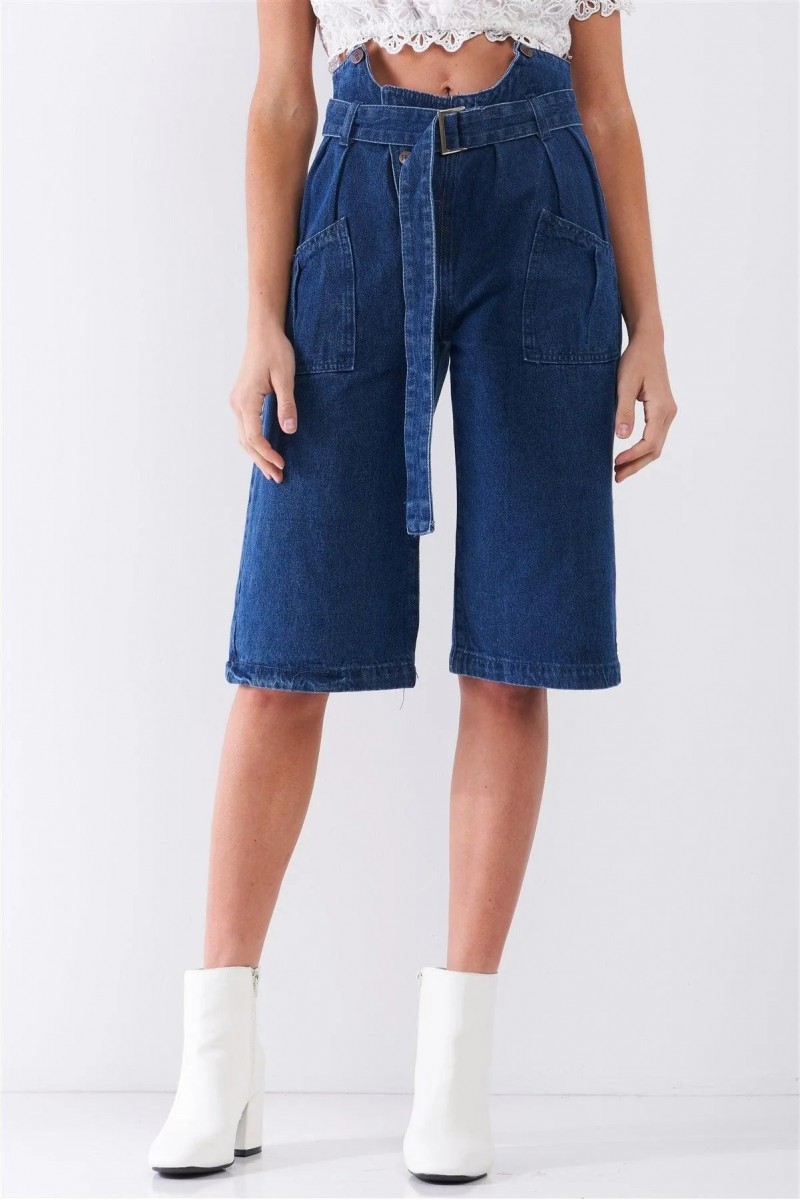 Design: Dark Blue Denim Front Cut-Out High-Waist Buckle Self-Tie Belt Detail Midi Flare Jean Pants — a unique pair of jeans featuring stylish front cut-outs and a high-waisted fit.