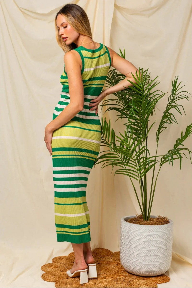 This sleeveless round neck stripe ribbed slit midi Knit dress combines elegance and comfort, making it a versatile addition to any wardrobe. Crafted from a soft, stretchy fabric, it features a flattering ribbed texture and stylish stripes that enhance the silhouette. The midi length and side slit provide a modern touch, allowing for ease of movement while maintaining a chic appearance. Perfect for both casual outings and more formal occasions, this dress can be effortlessly styled with accessories to suit any event.