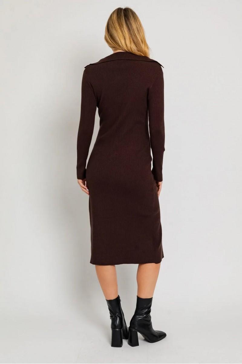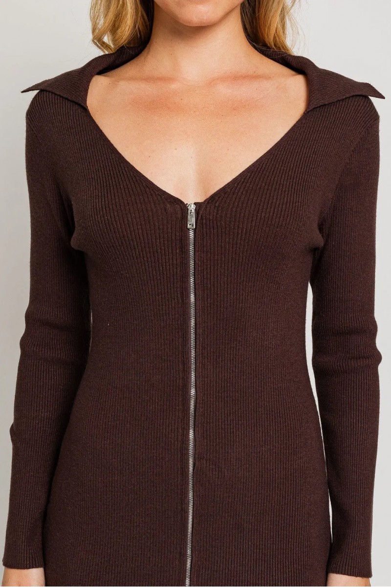 Elevate your boutique's fall collection with our sultry yet sophisticated zip-front dress! This trending midi dress in rich chocolate brown combines modern edge with classic sophistication. Perfect for boutiques catering to fashion-forward customers who appreciate versatile pieces with a hint of allure.