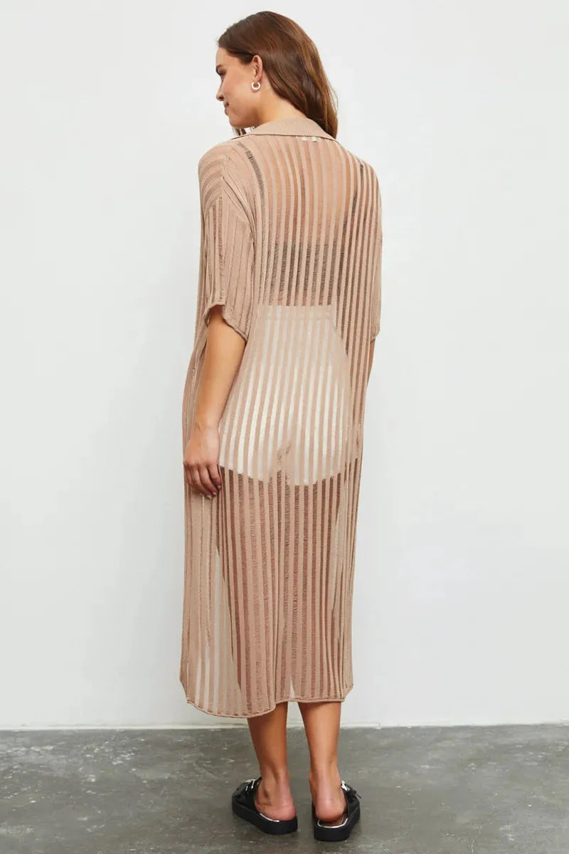 Unleash your inner fashionista with our Long Sleeve Button Down Distress Collar Sheer Duster Cover Up! Keep it chic and casual with this versatile piece that features long sleeves, a button down front, and a trendy distressed collar. Perfect for any occasion, this cover up will elevate your style game and keep you comfortable all day long!