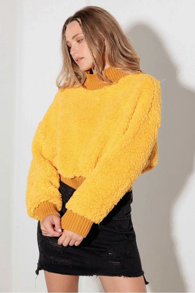 Fuzzy Ribbed Mock Neck Teddy Crop Sweater