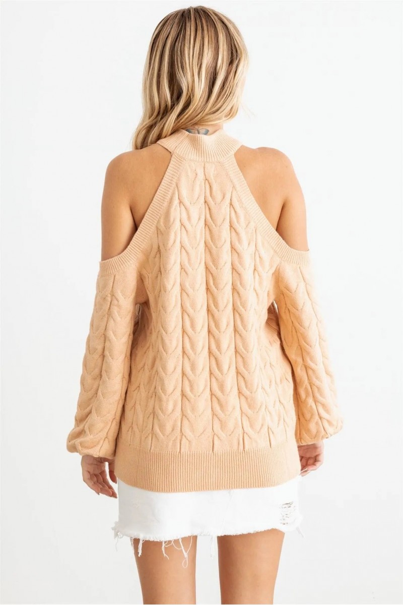 Cable Knit Mock Neck Cold Shoulder Long Sleeve Sweater