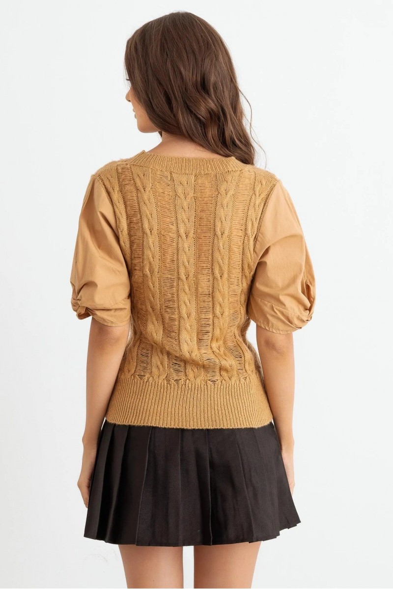 Nude Distressed Cable Knit Puff Short Sleeve Sweater /2-2-2