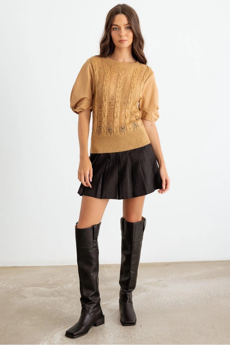 • Product Code: Nude Distressed Cable Knit Puff Short Sleeve Sweater /2-2-2