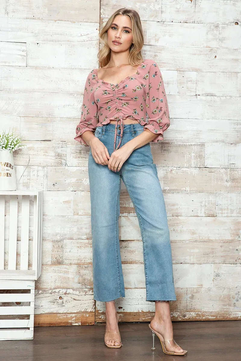 Elevate your boutique's spring collection with our versatile floral crop top. This charming piece features a sweetly ruched front with adjustable drawstring ties and delicate ruffle trim that your style-conscious customers will instantly adore. Perfect for pairing with high-waisted jeans, shorts, or skirts, this feminine top offers the ideal balance of trendy design and timeless floral appeal that today's fashion-forward shoppers are searching for.