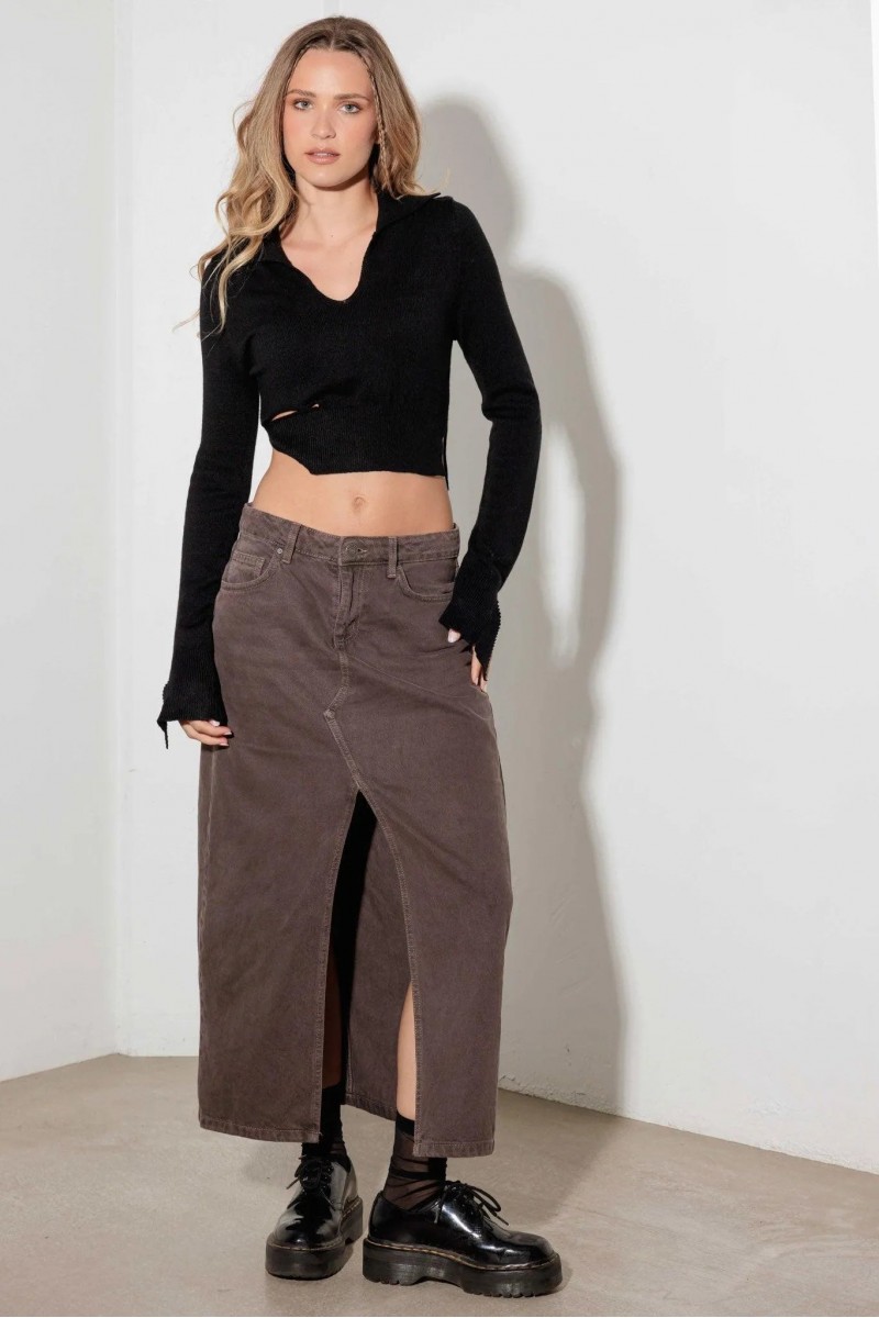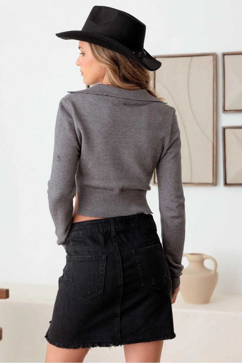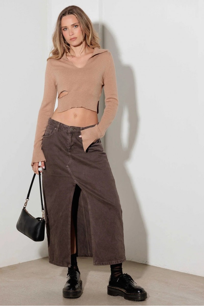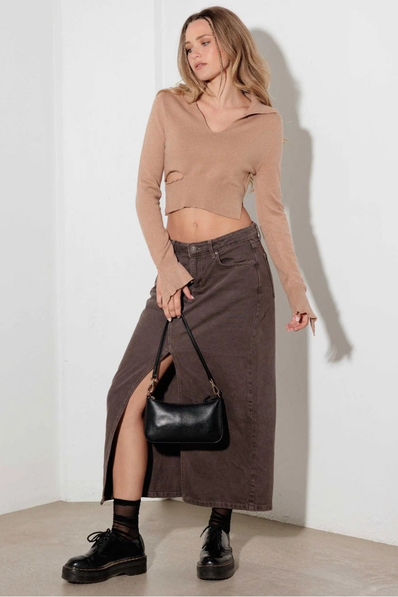 Design: Cut Out Collared Crop Soft Long Sleeve Sweater Top — a chic, trendy cropped sweater with a unique cut-out collar for an edgy, fashionable look.